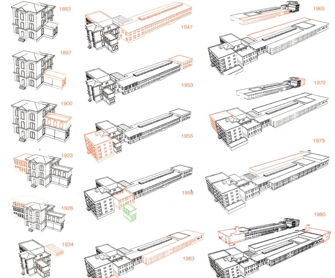 The building’s growth spurts can be seen in the delineation of the physical materials that were used in its construction. The progression of the additions is most clearly evident in the basement where you can see the sharp contrast between the limestone, terra-cotta, and concrete blocks. And the exterior of the building, which has previously been brick, will largely incorporate glass in the new expansion.