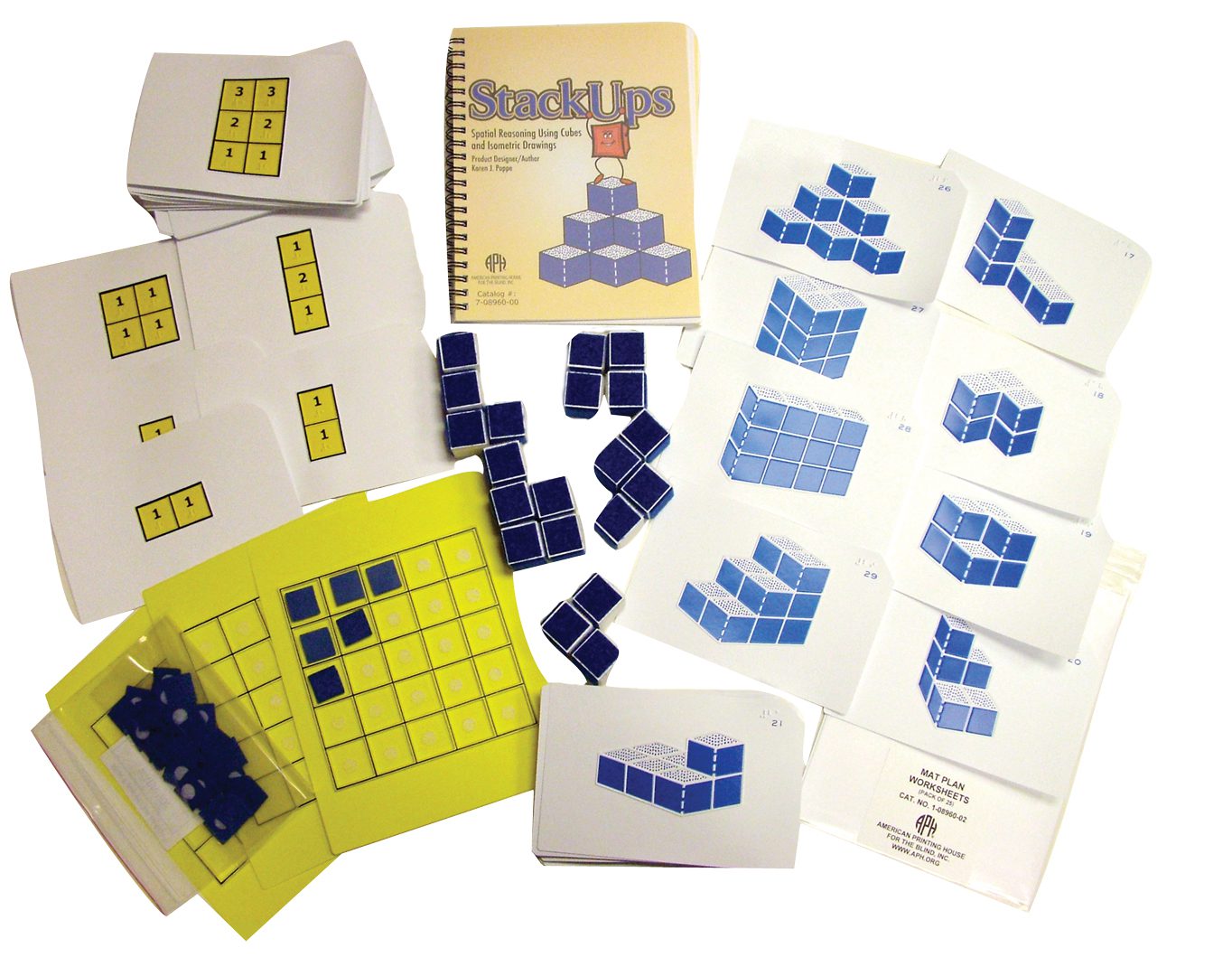 StackUps: Spatial Reasoning Cubes and Isometric Drawings is a set of materials designed to assist students with visual impairments and blindness in the interpretation of raised-line graphics depicting 3-dimensional figures, specifically stacked cube arrangements.