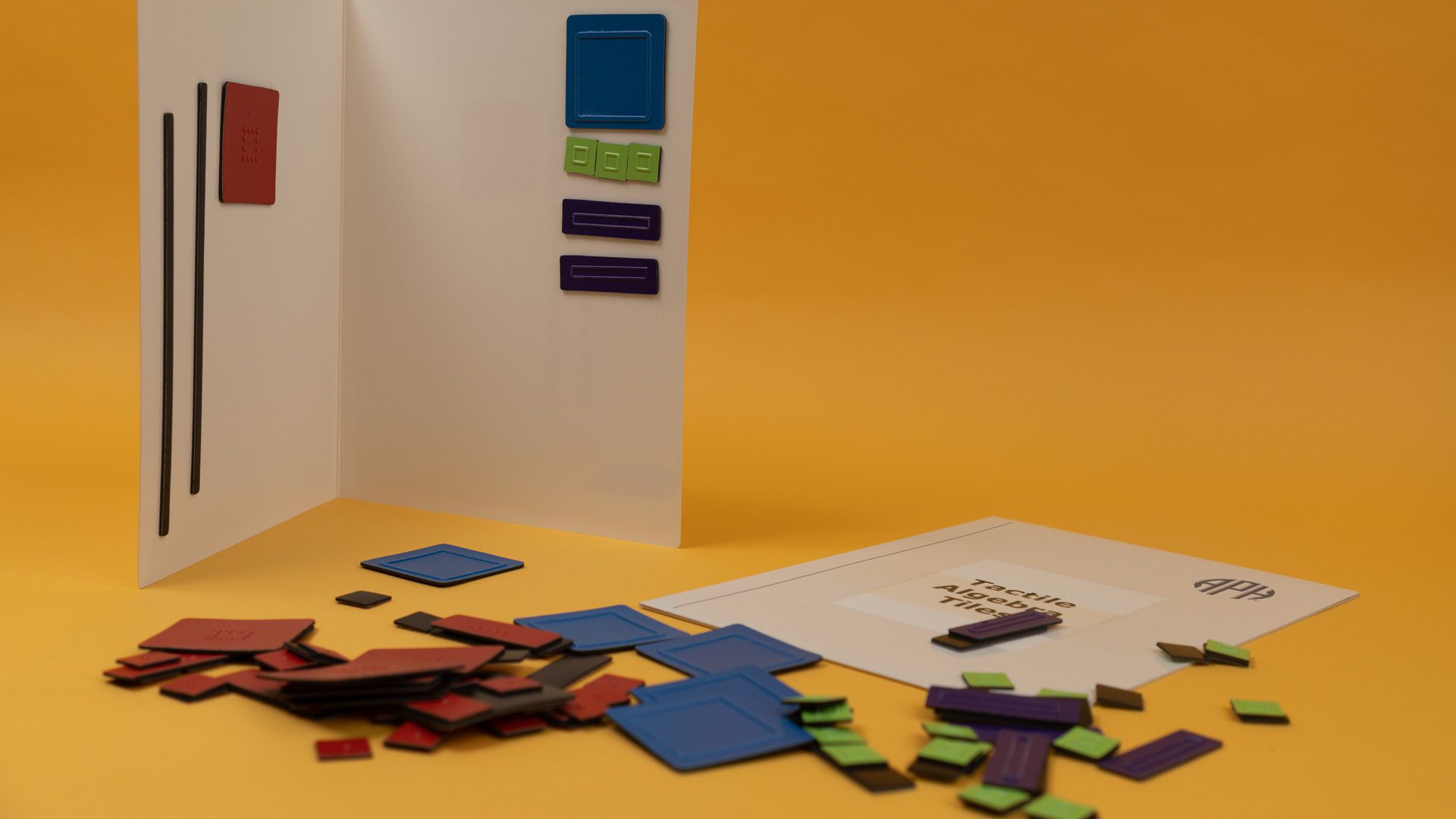 Tactile Algebra Tiles is an accessible version of traditional algebra tiles. The product allows visually impaired students to work alongside sighted peers. It includes magnetic tiles that can be manipulated on a steel board. Various colors and tactile symbols help students differentiate between tiles.