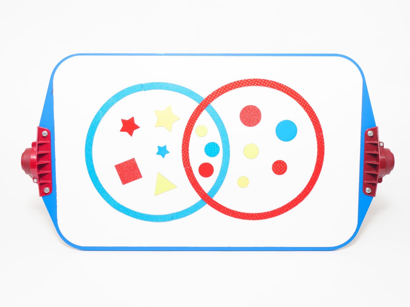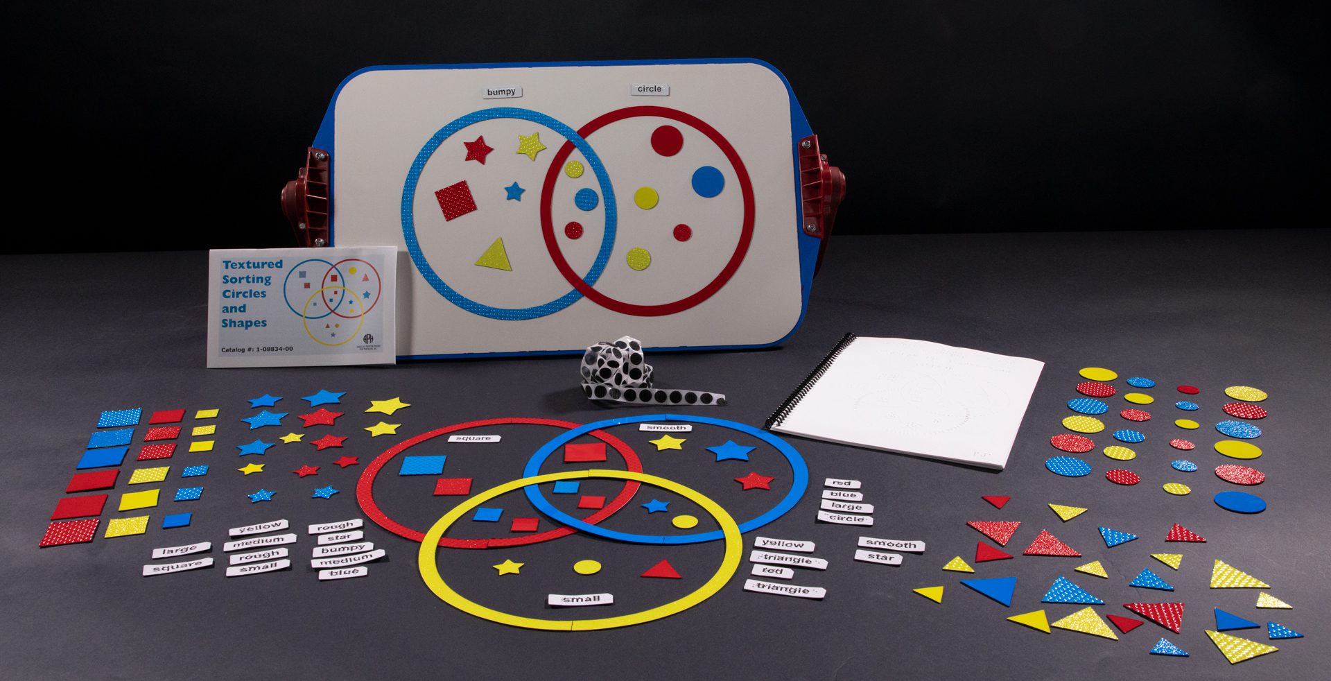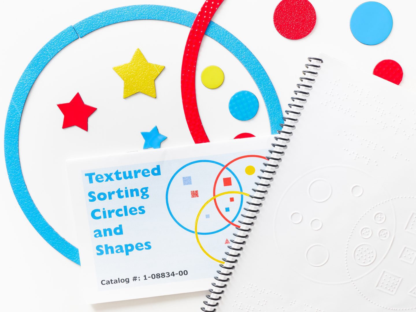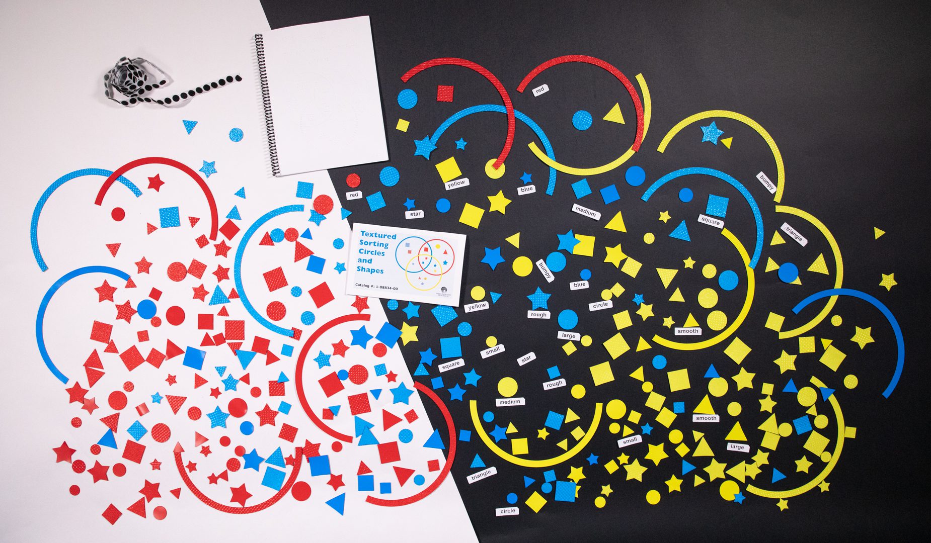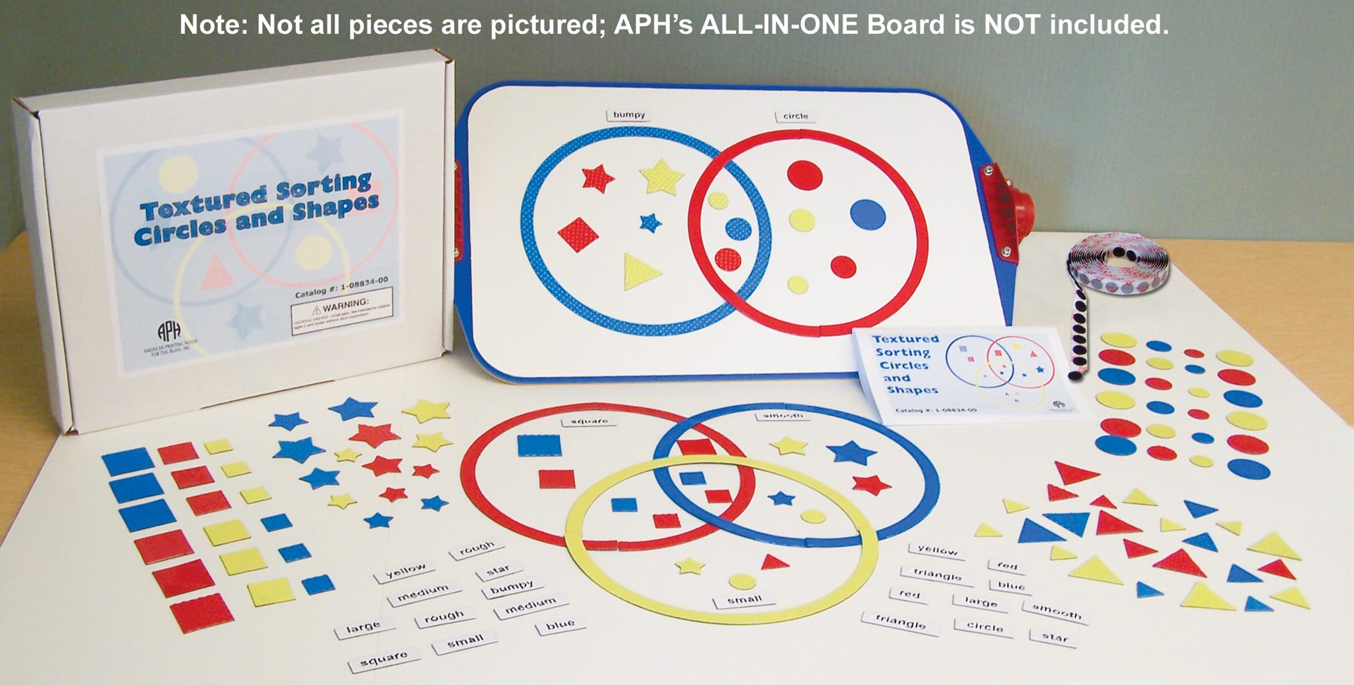 All textured shapes and sorting circles have a magnetic backing and are ready for use on a metal surface (e.g., APH’s All-In-One Board, SOLD SEPARATELY). They can also be used with a hook/loop material board – Hook material dots are provided and can be applied to the magnetic side of the shapes and sorting circles.